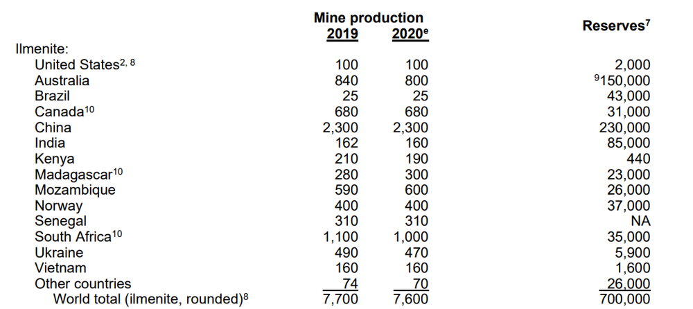 Theo USGS, tính đến tháng 10/2020, Mozambique (36%), Australia (14%), Việt Nam (11%) và Kenya (11%) là những nguồn cung cấp tinh quặng titan hàng đầu cho Trung Quốc. Tại Ả Rập Xê Út, do các vấn đề kỹ thuật và lo ngại về đại dịch COVID-19, việc vận hành dự án sản xuất xỉ titan lên tới 500.000 tấn mỗi năm đã bị trì hoãn đến năm 2021.